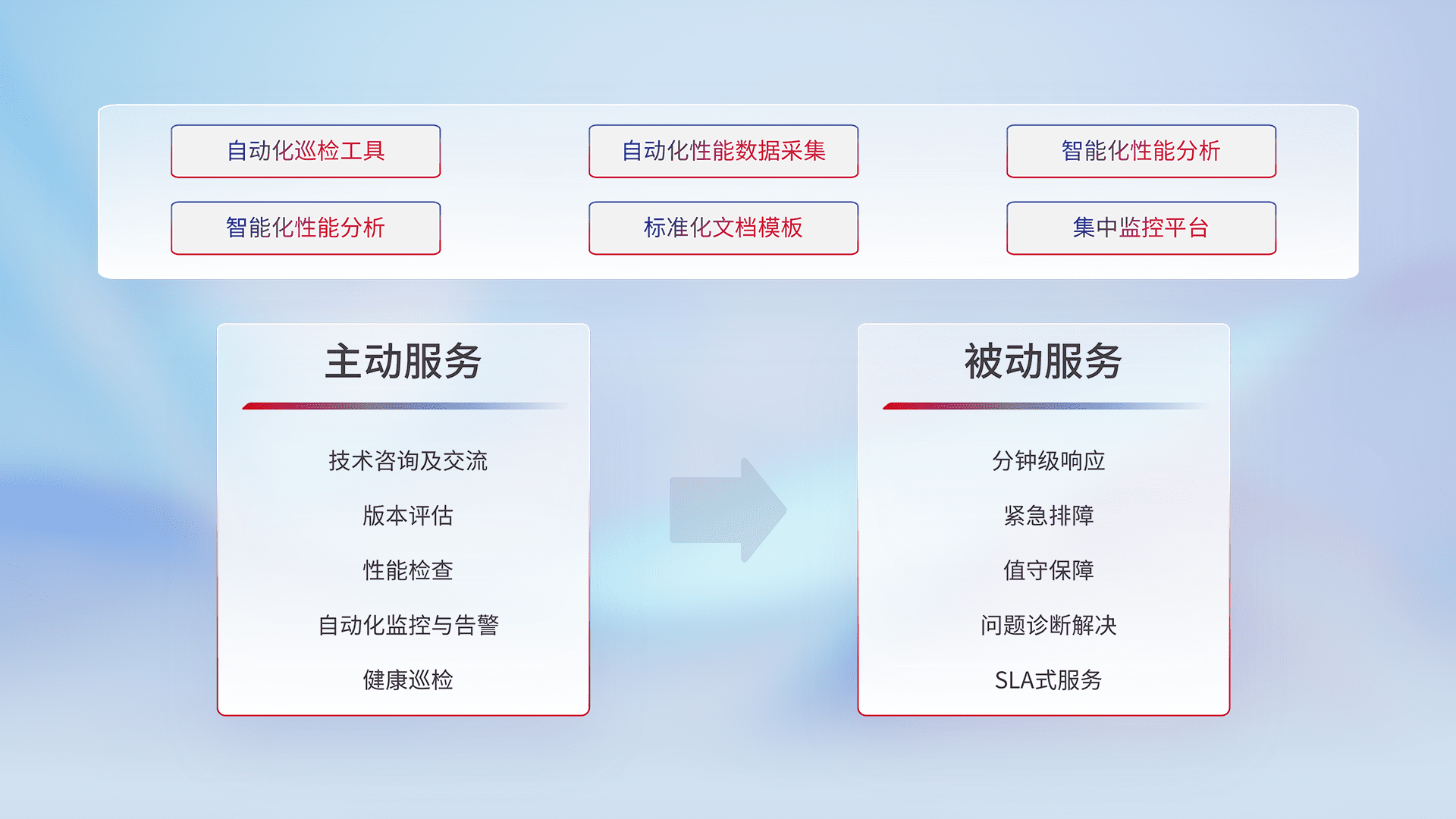 智能化工具和标准化文档,,保障服务质量,,,提供主动服务(包含技术咨询、、、、版本评估、、性能检查、、、、自动化监控与告警、、、健康巡检)和被动服务包含(分钟级响应、、、、紧急排障、、、、值守保障、、、、问题诊断解决、、SLA服务)。。